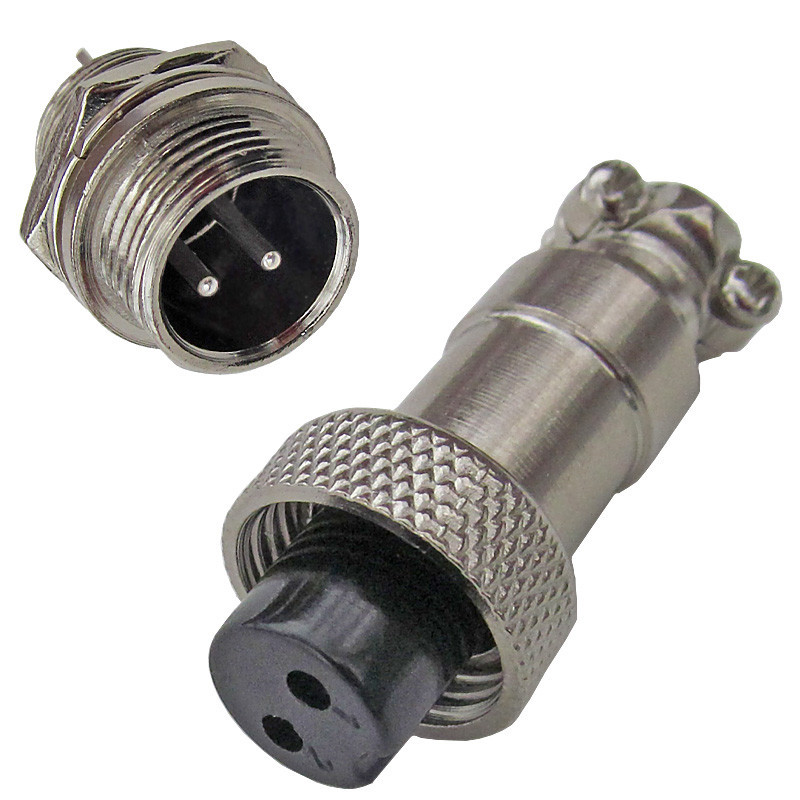 Штекер + роз'єм живлення GX12-2P, 12 mm, 2 контактів, монтажний. Кабель до штекера кріпиться за допомогою паяння.
