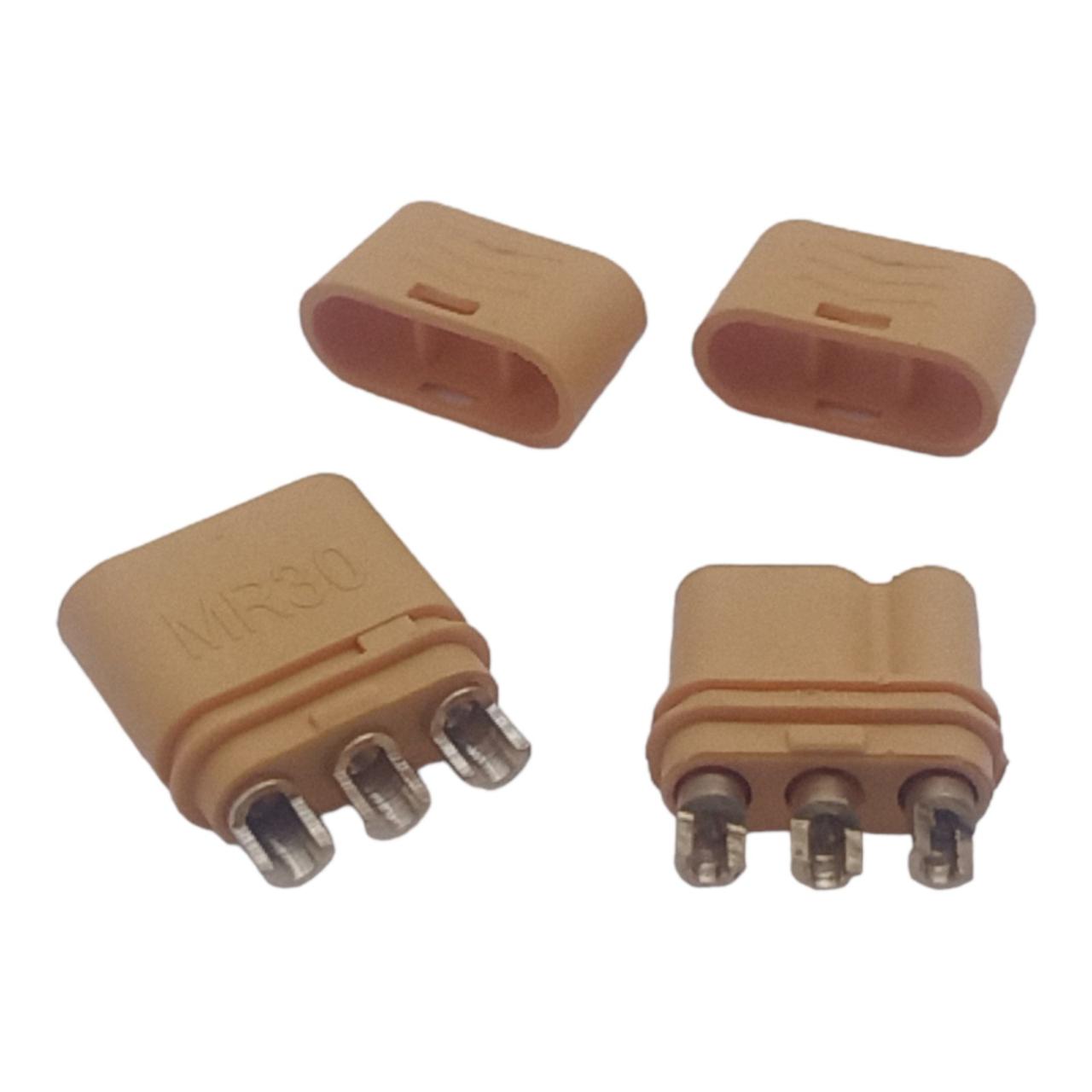 Роз'єм MR30 призначений для з'єднання двигунів із регуляторами швидкості. Він здатний обробляти токові навантаження до 30 А. Контакти роз'єму виготовлені з позолоченими пружинними елементами, що забезпечує надійне з'єднання навіть за високих і тривалих навантажень. Корпус роз'єму має спеціальну форму, яка захищає від переполюсування контактів. У комплекті з роз'ємом постачаються пластикові напрямні для дротів, що забезпечують зручне та надійне під'єднання.
