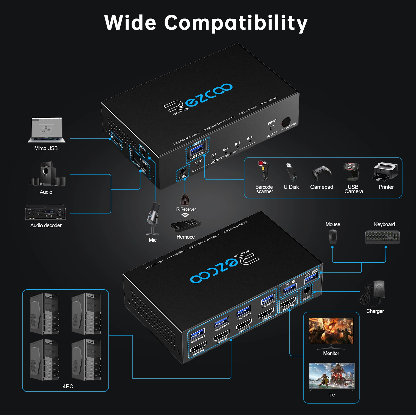 4-портовий KVM-перемикач HDMI2.0 дає змогу перемикати 4 HDMI порти на один дисплейний термінал. Водночас цей комплект дає змогу вам легко керувати 4 джерелами сигналу всього лише за допомогою одного комплекту клавіатури та миші, перемикаючи в будь-який час за допомогою пульта дистанційного керування, кнопок на пристрої або клавіатури та миші. Цей KVM-перемикач HDMI2.0 підтримує відеоформати, включно з 720p, 1080i, 1080p, 4K/30Hz, 4K/60Hz YUV4:4, 8bit. І всі системи Windows, Unix і Mac OS X. Сумісний із базовими дротовими/бездротовими клавіатурами та мишами.